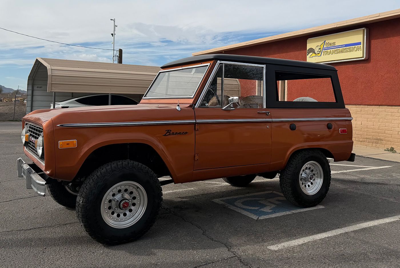 Orange and white vintage Toyota Land Cruiser parked in front of a building with a Jeep visible behind it.